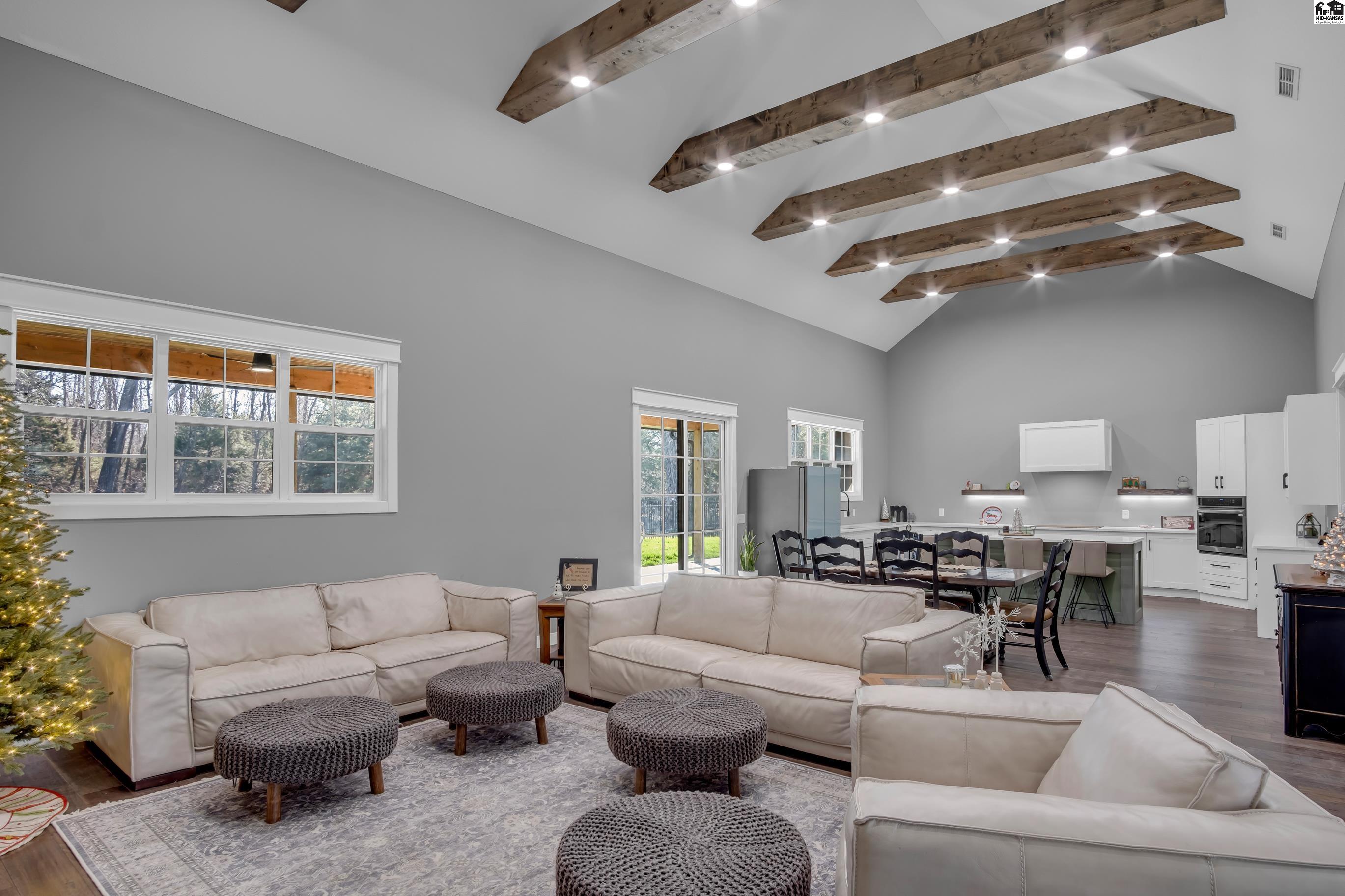 This stunning 2024 contemporary build is a blend of luxury, efficiency, and functionality. The home’s 3909 sq ft has 4 bedrooms, 2.5 bathrooms, and premium upgrades throughout. As you walk in the front door or the back patio doors you enter the expansive great room with soaring 20 foot ceilings, an abundance of room to entertain. Plenty of space for a large dining table. Open into the modern kitchen, featuring, built in appliances, plenty of cabinets, large island, and granite counters. The walk-in pantry also serves as a storm shelter. A half bath and large laundry room are close to the garage for convenience. Also, on the main floor there is an oversized master bedroom, a large walk-in closet, and a must see luxury master bath, featuring a smart shower. On the second floor there are 3 additional bedrooms, one bath and a bonus room, plus amazing storage area. You will find a back patio, 44 x 14, on the east side, what a great spot to cook or relax overseeing the peaceful pond and frequently visiting deer approaching from the surrounding wooded area. The garage is a rare find, having smart garage doors and security lighting, it is an impressive 3200 sq. ft. offering incredible versatility, dedicated office space, enclosed climate controlled shop area for your hobbies. A full bath and dog wash station already framed and plumbed just waiting to be completed. The home has wood siding and class 4 high impact roofing, underground sprinklers, 2 of the HVAC are geothermal.